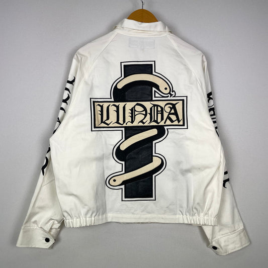 【中古品】【メンズ】 MADTOYZ マッドトイズ × 荒くれKNIGHT 別注 コラボ LOGO PRINT COTTON JACKET ロゴ プリント コットンジャケット ライトアウター "輪蛇" 147-251204-yy-20-tei サイズ:M カラー:ホワイト 万代Net店