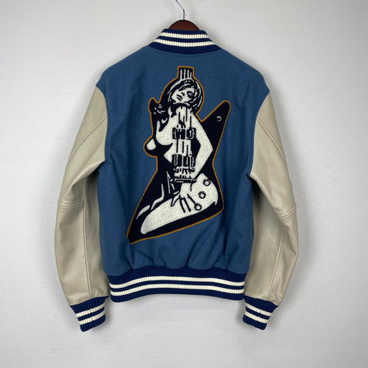 【中古品】【メンズ】 HYSTERIC GLAMOUR ヒステリックグラマー TURN THE MUSIC UP刺繍 STADIUM JUMPER 02243AB10 TURN THE MUSIC UP刺繍 スタジャン ライトアウター 140-251204-yy-04-tei サイズ:S カラー:ブルー 万代Net店