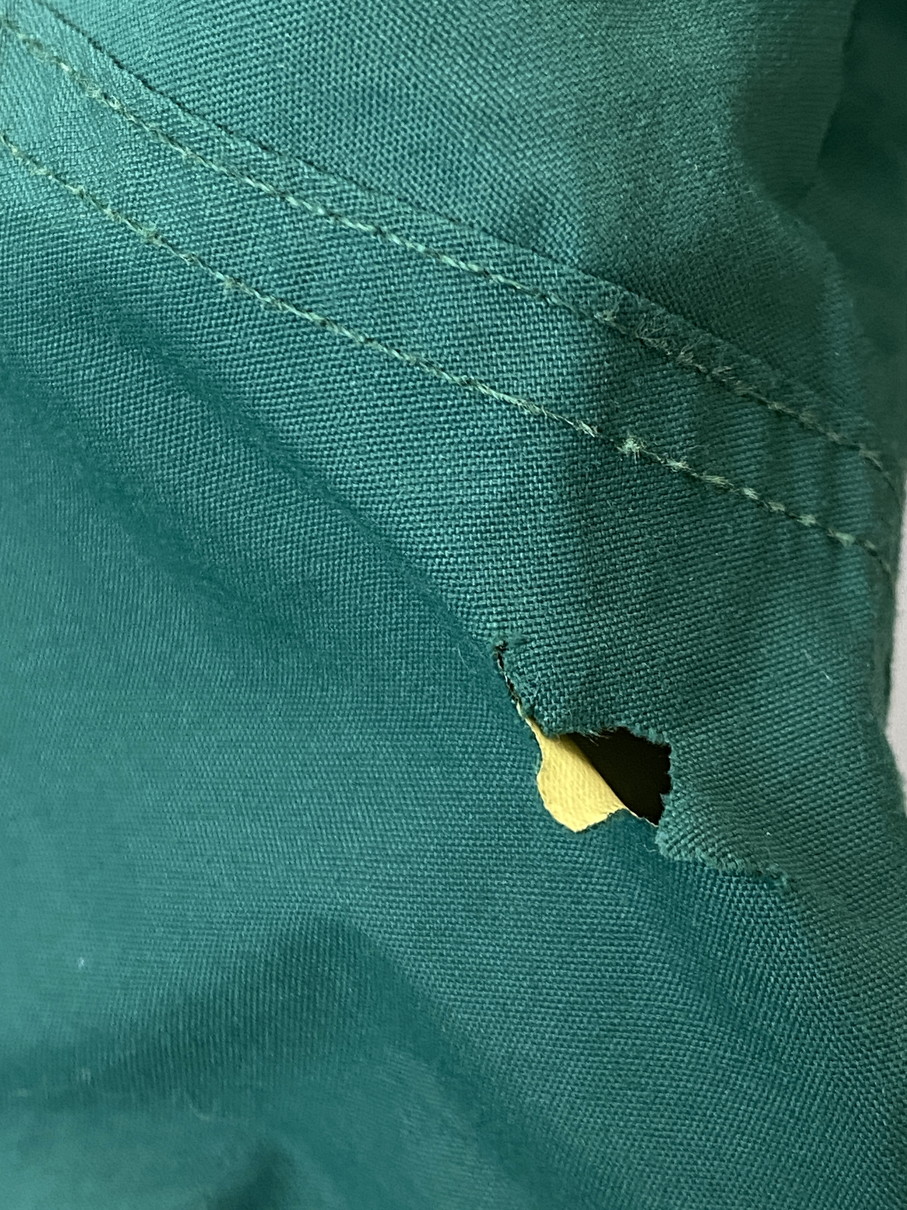 汚れ、スレ、ほつれ、タグ不鮮明、左脇に破れ、フード欠損等が見られます。